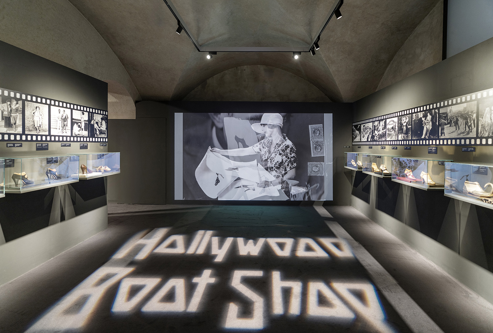 The atmosphere is evocative of a vintage movie theater, with a soft, muted glow reminiscent of the flickering light inside an old film projection room. Along the walls, framed photographs and film stills capture iconic moments from early Hollywood productions, each accompanied by the very shoes Salvatore Ferragamo crafted for those silver screen legends.