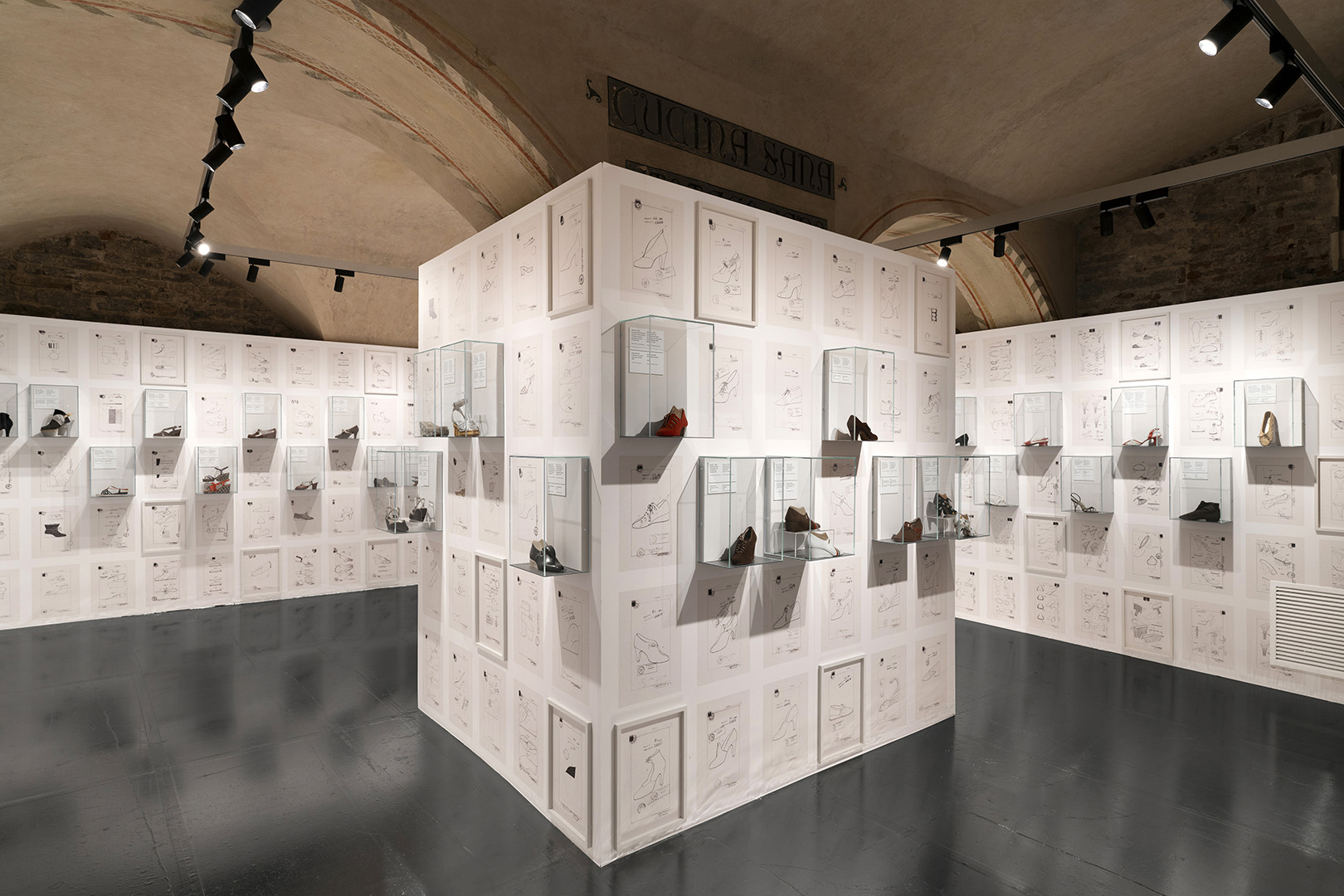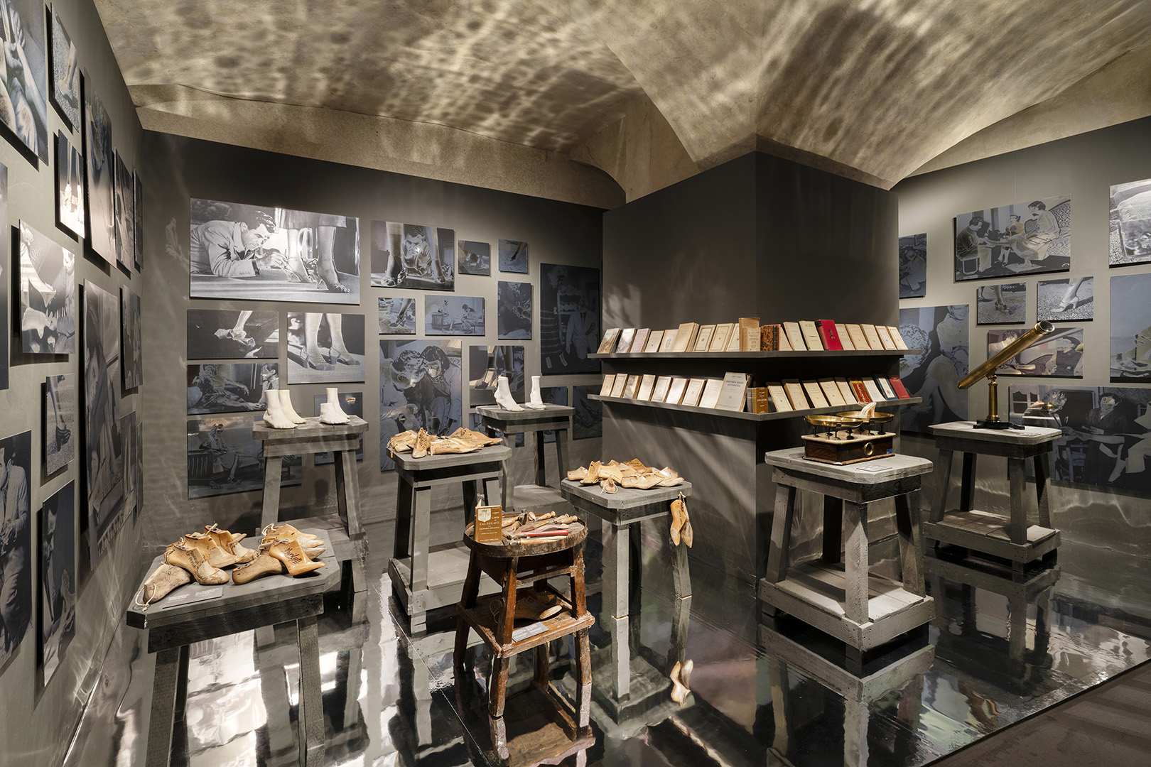 This library is reconstructed symbolically in a room of the exhibition, whose walls are dominated by laminated printed photographs of Salvatore, alongside just a small part of the widespread collection of wooden molds of the feet of his clients, shaped to match the unique anatomy of each foot. Each last bore the name of its owner, serving as a tangible reference every time Ferragamo crafted a new pair of shoes.