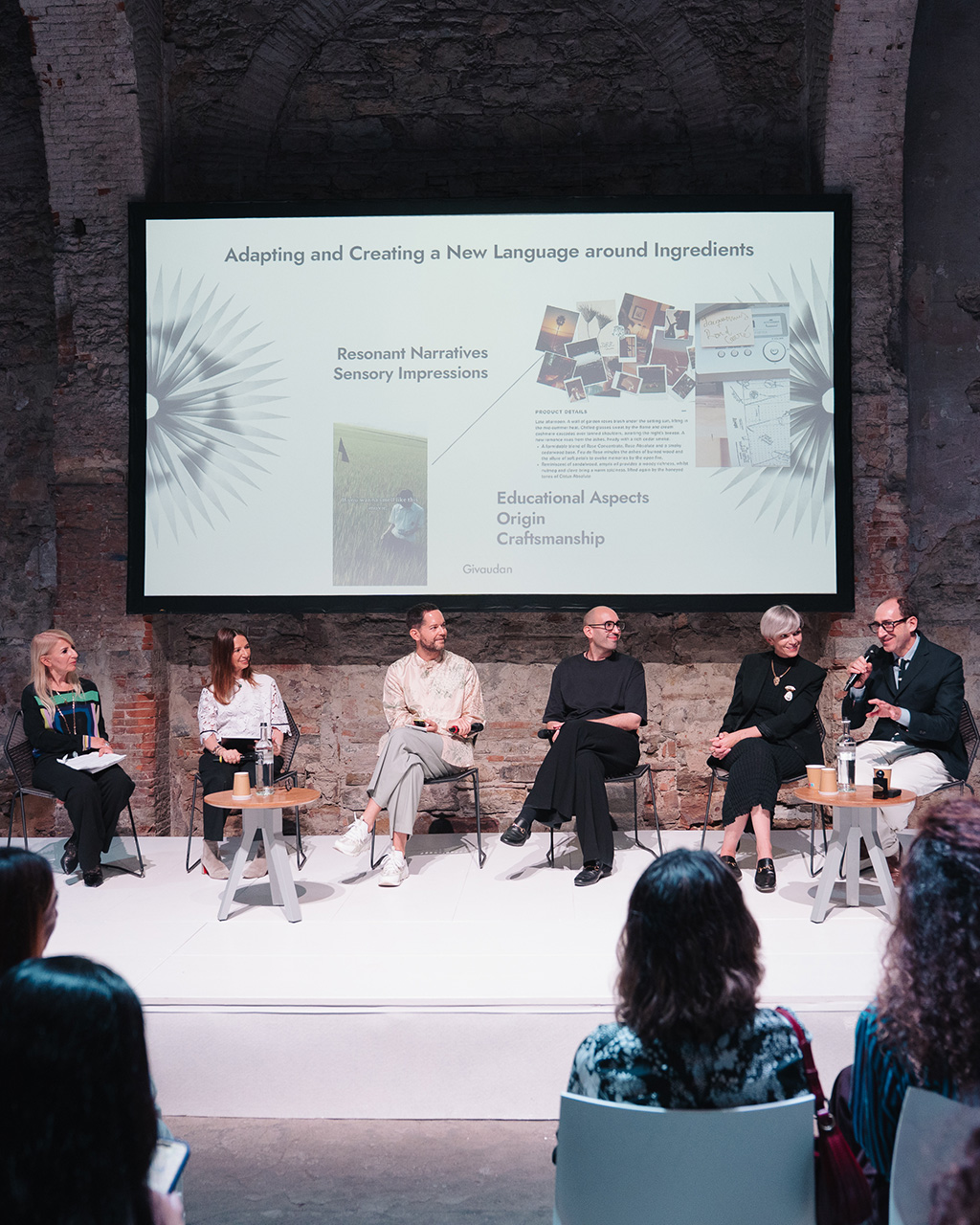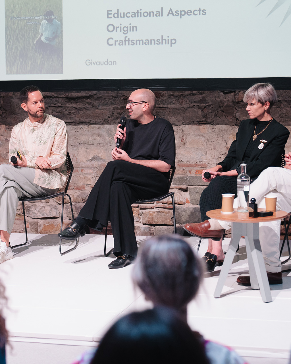 The conversation featured Arnaud Guggenbuhl, Head of Global Marketing, Insight and Image Fine Fragrances at Givaudan, alongside Philippe Solas, CEO Une Nuit Nomade, Francesca Giulia Tavanti, Director of Education at Istituto Marangoni Firenze, and Marco Martello, Scent Editor for The Greatest magazine and author of La Formula del Sentire, moderated by editors Francesca Delogu and Silvia Manzoni.