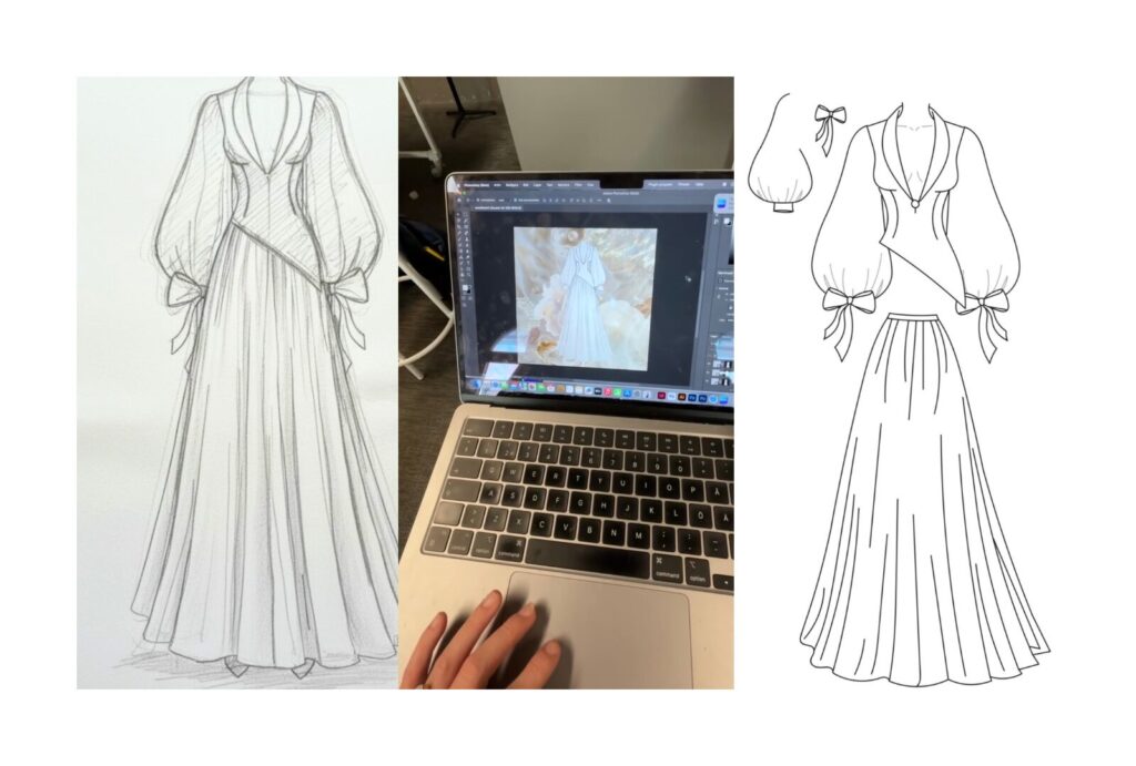 The story of how we met may seem simple, but for me it was a turning point in learning to believe in myself. Tale posted an Instagram story asking whether any designers or brands would like to collaborate with her for Elle Gala 2025. At first, I scrolled past it, thinking, “I’m not even a design student.” I had done a few sketches, but not many, and I had never really shared them outside of class. A few minutes later, I changed my mind. Tale was actually the first Norwegian influencer I started following because I admired her sense of style, so I already had a clear understanding of her aesthetic. The idea for the dress came to me quite quickly. I reviewed her profile once more to ensure my concept aligned with her vibe, then sat down and created a quick sketch. I sent it to her via DM, along with a short message introducing myself and explaining my vision. To my surprise, she replied and loved the idea. From that moment on, we worked together to develop the final look.